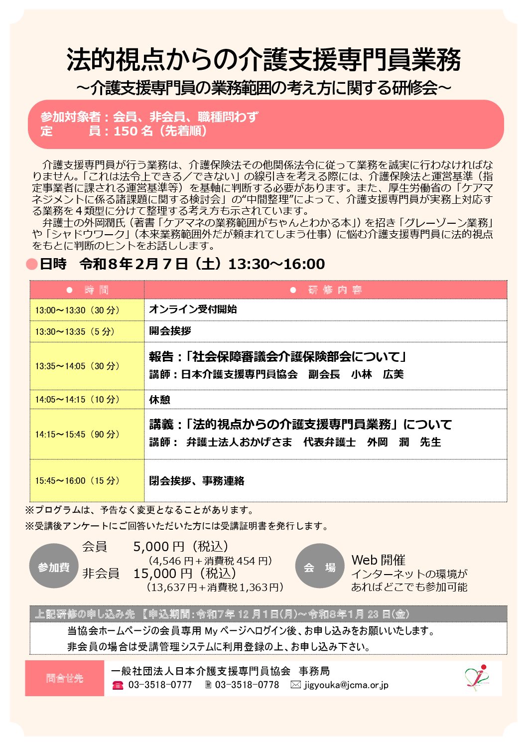 拝啓 時下ますますご清祥のこととお慶び申し上げます。平素より、当協会の活動に格別 続きを読む 「法的視点からの介護支援専門員業務~介護支援専門員の業務範囲の考え方に関する研修会~」
