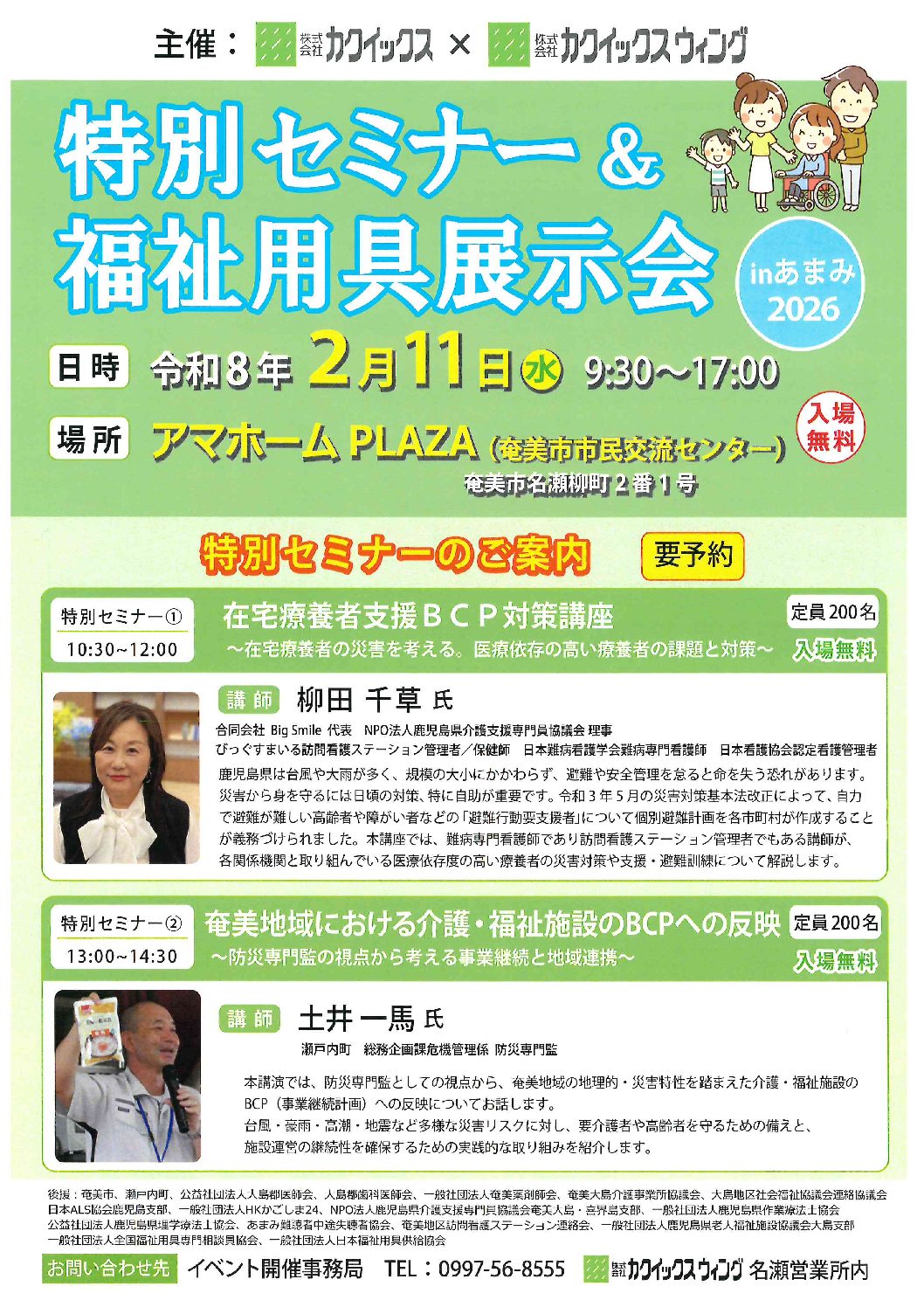 日時:令和8年2月11日(水)9:30~17:00 場所:アマホームPLAZA 続きを読む 【特別セミナー&福祉用具展示会inあまみ2026のお知らせ】